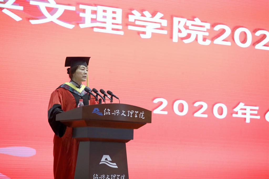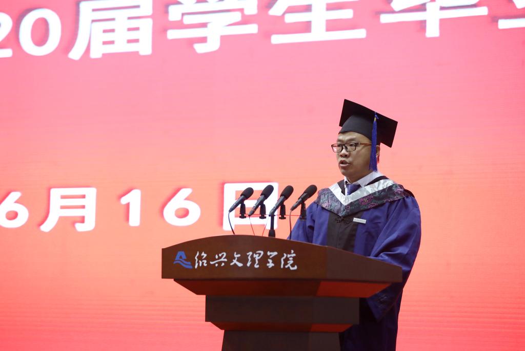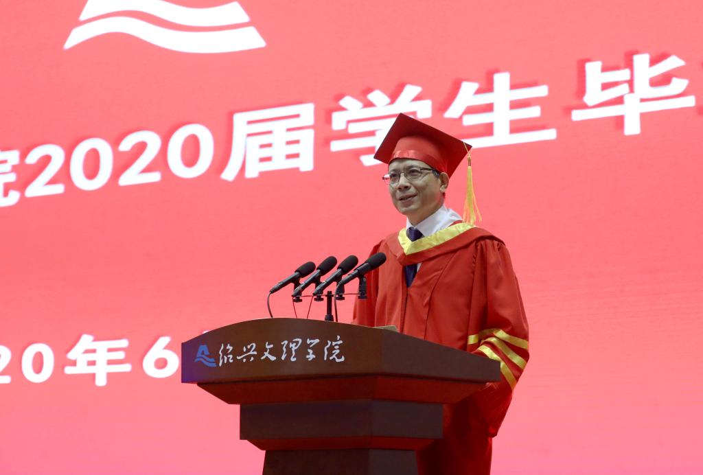 王建力致辞。他祝福3228名2020届毕业生从最初的青涩懵懂到今日的学业有成,赞许他们取得的进步、收获的荣誉。王建力悉数近年来学校在内涵建设上取得的标志性成果,勉励师生共同努力,“不久的将来,这座具有江南水乡特色的‘千年古城•现代大学’一定会在古越大地上崛起。”