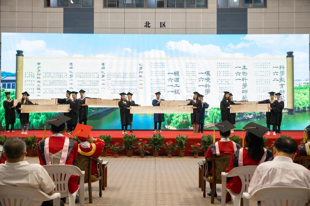 初见时,你们从广袤的祖国各地来到绍兴这座美丽的江南古城,稚气未脱的脸上带着青涩和懵懂。在文理,你们不负韶华,356人被评为省、市优秀毕业生,用出色的成绩为大学生活画上了圆满的句号。你们追求卓越,359人考取博士、硕士研究生,即将奔赴曼彻斯特大学、浙江大学等高校深造。你们立志奉献,17人报名参加“西部计划”、22人应征入伍,将到祖国最需要的地方贡献青春和才智。还有更多的同学积极投身学术科研、文体活动、社会实践、志愿服务,综合素养全面提升。成长的背后,我看到你们用汗水收获了学识涵养,用拼搏实现了青春梦想,用奋斗惊艳了文理时光。在这里,你们也见证了学校的发展。你们参与了教育部对学校本科教学工作的审核评估,见证了学校被列入省“十三五”高校设置规划,并顺利通过省高校设置评议委员会专家组现场考察,庆祝了学校110周岁的生日,也迎来了投资62亿元的校园改扩建工程的正式启动。不久的将来,这座具有江南水乡特色的“千年古城•现代大学”一定会在古越大地上崛起。