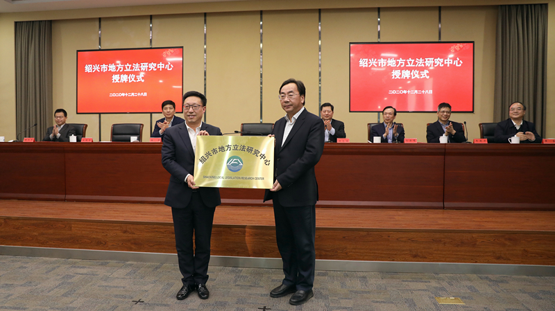 马卫光为绍兴市地方立法研究中心授牌,汪俊昌接牌。