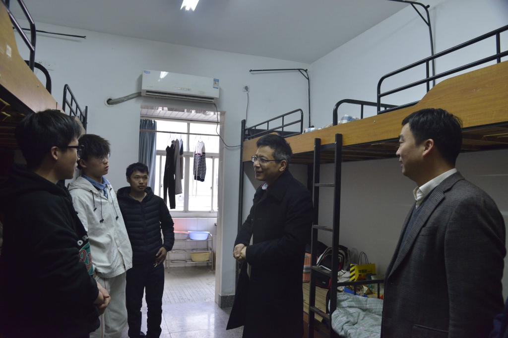 2月11日除夕当天上午,校长王建力看望慰问春节期间留校学生。党办、校办、学工部、研究生处、保卫处、后勤管理处等职能部门负责人陪同。