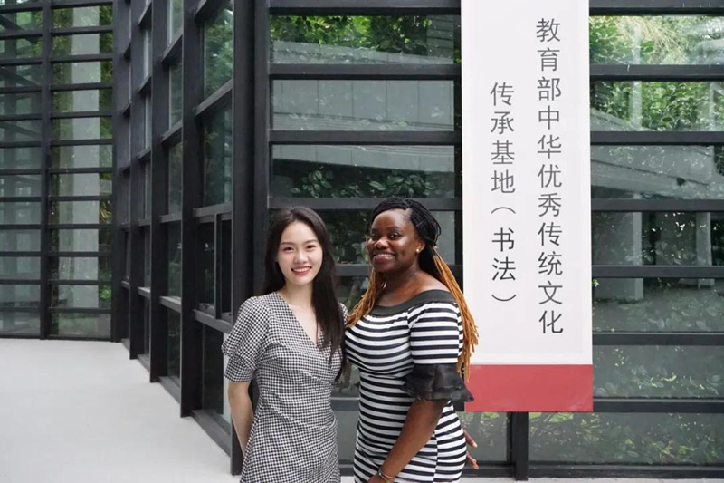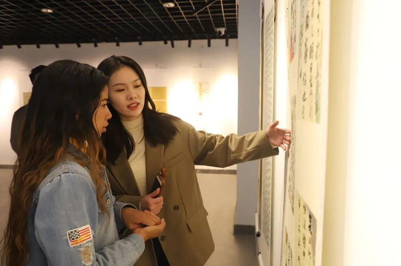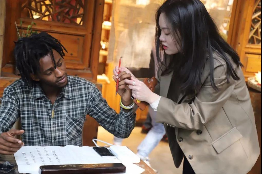 她喜欢和他们聊天,听他们问一些关于书法的天马行空的问题,比如他们用插着腰的茄子来记忆壶。“中国书法”对这些外国朋友的吸引力让她产生了强大的民族自豪感,她想让更多的外国人了解到中国书法及书法背后的文化内涵。