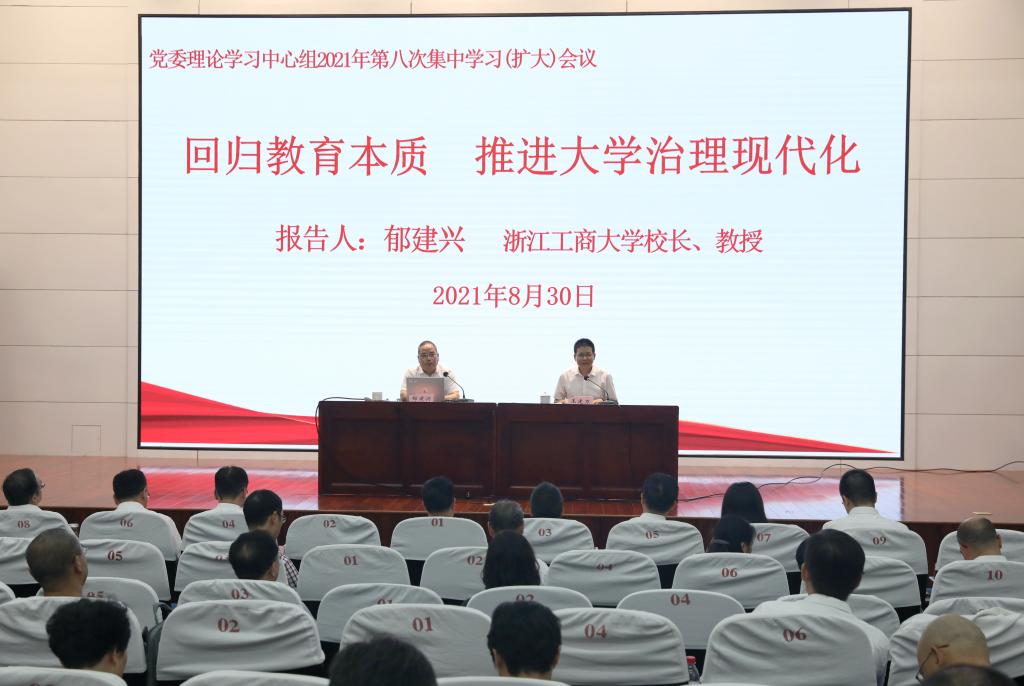 8月30日下午,学校在铁城报告厅举行校党委理论学习中心组集中学习(扩大)会议,邀请了浙江工商大学校长、教育部长江学者特聘教授、浙江省特级专家郁建兴作题为《回归教育本质,推进大学治理现代化》的专题辅导报告。全体中层干部、校院两级党委理论学习中心组成员参加会议。本次学习会既是学习习近平总书记“七一”重要讲话精神专题培训班的重要培训内容,也是学校暑期中层干部读书会的一次重要学习安排。校长王建力主持会议。