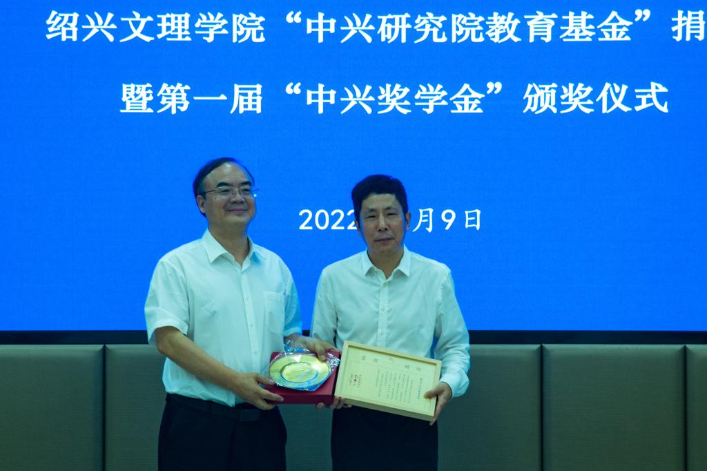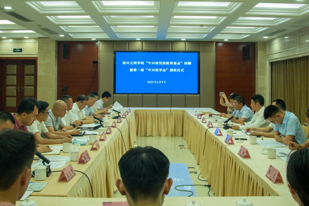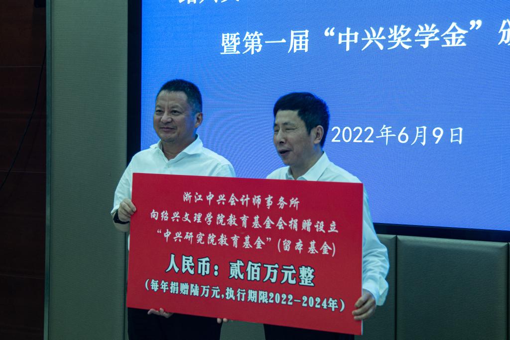 6月9日下午,“中兴研究院教育基金”捐赠暨第一届“中兴奖学金”颁奖仪式在铁城科教馆一楼会议室隆重举行。浙江中兴会计师事务所所长马洪明及事务所班子成员,绍兴市财政局会计处副处长张挺,校党委副书记沈赤、副校长黄坚,商学院领导班子成员及获奖学生代表参加颁奖仪式。