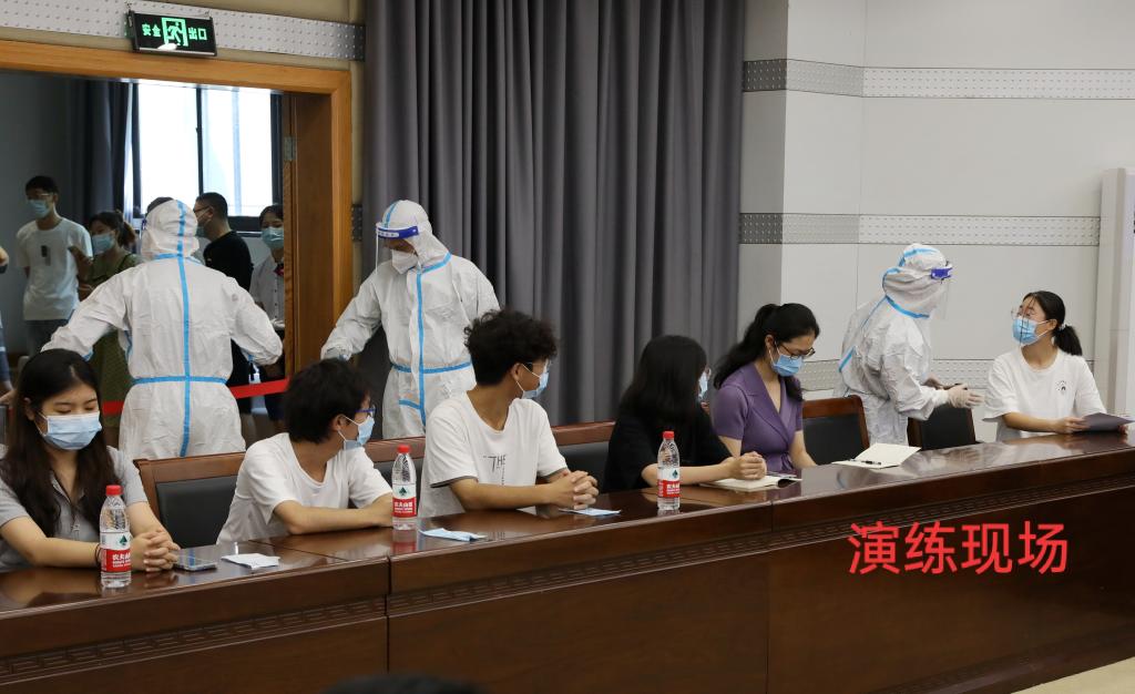 本次演练模拟新生报到途中高铁同车厢有阳性病例,该名新生已到校,校内停留地为寝室和图书馆,被判定为密接者应急处置。演练场景设在图书馆一楼报告厅,一名新生在自习室自习,被判定为密接者,学校展开一系列应急处置措施。演练人员穿戴医疗防护装备,模拟教室封控、人员管控转运、流行病学调查、场所消杀等场景,整场演练组织有序、处置及时。