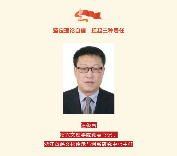 为深入贯彻落实党的二十大精神,学懂弄通领会二十大报告的精神实质、把握核心要义,按照省社科联“社科学者千名宣讲、百名访谈”的活动安排,第一时间组织了社科专家热议二十大报告系列。10月19日,“浙江社科”公众号推出10名省新型智库、省重点研究基地负责人的解读。校党委书记、浙江省越文化传承与创新研究中心主任汪俊昌教授围绕《坚定理论自信 扛起三种责任》谈了心得体会。