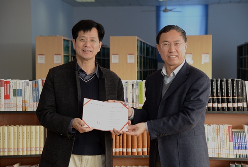 叶飞帆校长和俞可平校友一起为捐赠书籍专栏揭幕。同时,叶校长向俞可平校友颁发了捐赠证书。