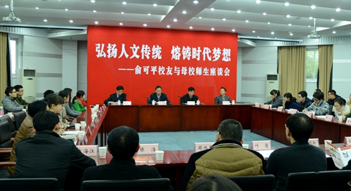 捐赠仪式结束后,以“弘扬人文传统 熔铸时代梦想”为主题的俞可平校友与母校师生座谈会举行。叶飞帆校长主持座谈会。校党委唐和祥副书记、钱水祥副书记,党校办、学工部、校友联络办、团委、图书馆与人文社科类学院相关负责人,历届明华人才奖学金获奖代表、明华人才奖学金培育对象及其他优秀学生代表应邀参加座谈。