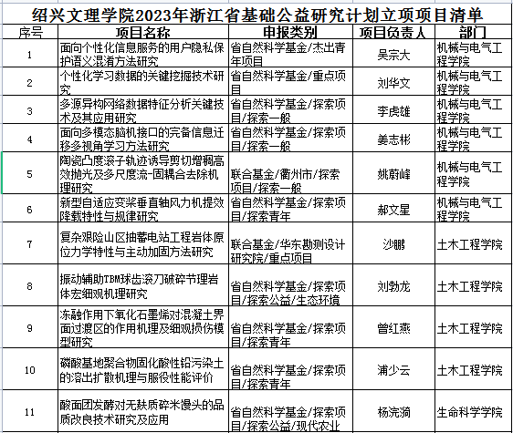 日前,2023年度浙江省基础公益研究计划项目立项评审工作已经完成。根据《浙江省科学技术厅 浙江省自然科学基金委员会 关于2023年度浙江省基础公益研究计划拟资助项目的公示》(http://zjnsf.kjt.zj.gov.cn/portal/detail.html?typeid=2018515&postid=1043227838162927616),我校共获批主持21项(具体项目见附件),分别是:机械与电气工程学院6项、土木工程学院4项、生命科学学院4项、化学化工学院3项、数理信息学院1项、纺织服装学院1项、医学院1项、元培学院1项。