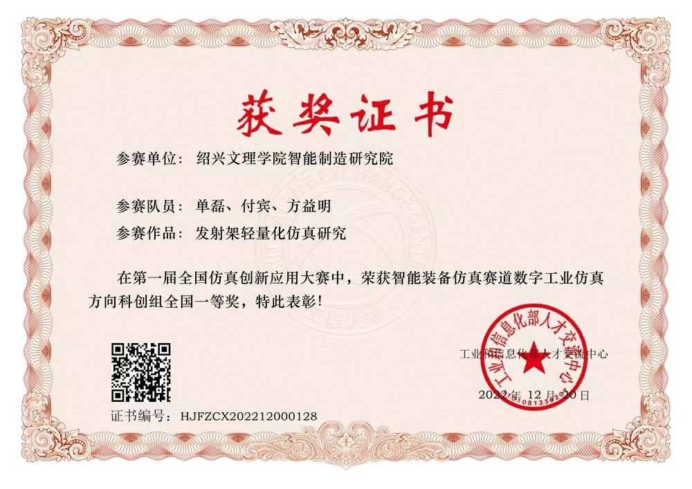 日前,第一届全国仿真创新应用大赛成绩公布,我校机械与电气工程学院团队作品《发射架轻量化仿真研究》荣获智能装备仿真赛道全国一等奖。