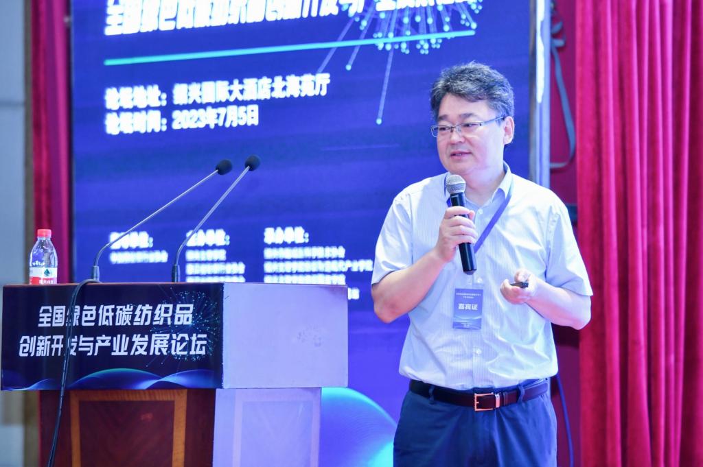 论坛主旨报告环节中,毛志平教授代表中国工程院院士、东华大学校长俞建勇作题为《纺织产业双碳发展战略及技术路线图》的论坛主旨报告。