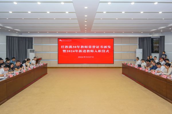 9月27日下午,学校在图书馆一楼报告厅召开任教30年教师荣誉证书颁发暨2024年新进教师入职仪式。校党委书记崔凤军,校长赵阳,校党政领导班子成员张宏、柳国庆、陈均土、黄曼等出席活动。副校长陈均土主持会议。