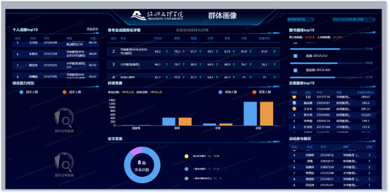 2024年1月,学校“数智评价”在2023级学生学期评价时全面试用,截止5月6日,现已全部完成2023级线上综合评价工作,生成4692位学生个人画像,15个二级学院群体画像。其中,数据库对接赋分数据111562条,职能部门管理员根据导入模板进行数据导入,系统根据导入字段实现赋分数据130542条,学生根据条目发起申请填写加分项具体内容、提交证明材料、提交审核进行申请数据877条,实现了平台数据对接、共享、录入、审核、赋分等完整功能和数据的实时更新及高效整合。