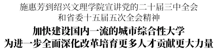 施惠芳指出,省委十五届五次全会系统阐释了浙江进一步全面深化改革的“战略考量为什么”“精髓要义是什么”“努力为之干什么”等重大问题,提出了“三个再”“五个更”奋斗目标。市委九届六次全会全面学习贯彻中央和省委全会精神,研究部署进一步全面深化改革、谱写新时代胆剑篇勇闯现代化新路子的思路举措。从中央的顶层设计、浙江的先行路径,到绍兴的落地实践,是一脉相承、一体贯通的,要将这些精神作为学校学科建设、理论学习、能力提升的重要内容,始终在时代潮流中把稳方向、站稳脚跟。