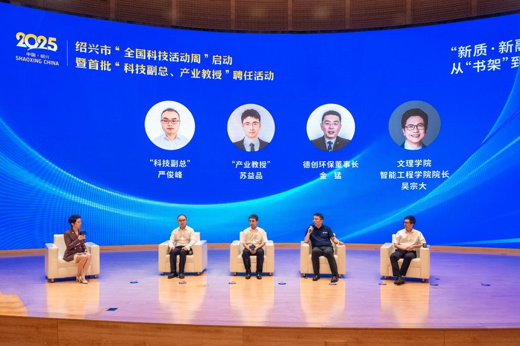 活动进行了“新质·新融”对话。“科技副总”严俊峰、“产业教授”苏益品、德创环保董事长金猛、我校智能工程学院院长吴宗大四位代表围绕“人才共享助推新质生产力”展开深入交流和探讨,为绍兴市的科技创新和产业发展提供了宝贵的思路和建议。