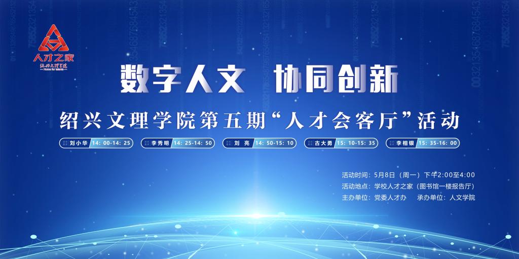 5月8日下午,第五期“人才会客厅”活动在学校“人才之家”举行。本期“人才会客厅”以“数字人文,协同创新”为主题,邀请了浙江越生文化传媒集团副总经理兼副总编辑、绍兴市文献学与数字文化研究中心主任李相银,兰亭书法艺术学院刘小华教授,图书馆李秀明教授,人文学院刘亮教授、古大勇教授作主题发言。校党委副书记沈赤,浙江越生文化传媒集团创始人、董事长寿林芬,校党委人才办有关负责人,学校相关学科高层次人才、师生近40人参加活动。此次活动由学校党委人才办主办、人文学院承办。