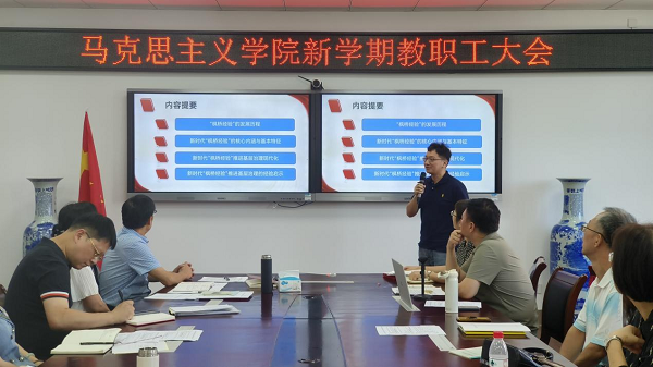 党日活动前,马克思主义学院召开了教工大会,党委书记陈红带领全体教职工开展政治理论学习,同时第一时间传达校党委书记汪俊昌对学院发展的要求和期望;院长杜坤林就学院上半年的工作进行了盘点与回顾,并就下半年的工作重点进行了部署;专业副主任周炫宇就开学第一课进行了说课展示。