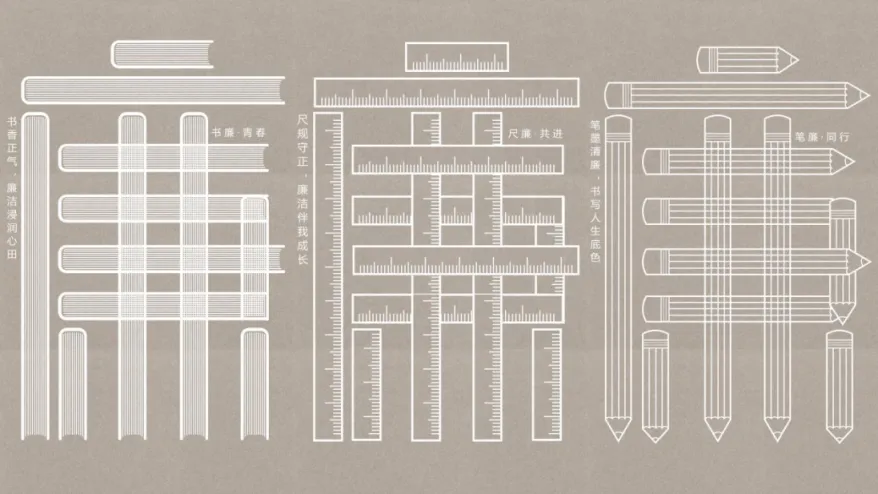 《“青”廉之魂,铸就未来》作品共有“书廉青春”“笔廉同行”“尺廉共进”三张海报。将象征校园文化的书、笔、尺为设计元素和“廉”字结合起来,结合了清廉文化的内涵,并用简洁的图形和文字结合,突出主题;分别以“书写人生底色”“廉洁伴我成长”“廉洁浸润心田”作为海报小标题,强调通过学习和成长,保持清廉正直的品质,才能为校园营造一个廉洁、正直的文化氛围。