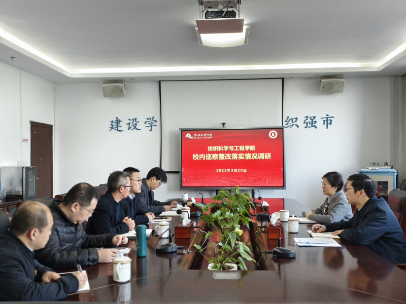 3月20日上午,校纪委书记唐晓青赴纺织科学与工程学院调研校内巡察整改落实情况。校纪委副书记、纪检监察室主任封国强陪同,纺织科学与工程学院党政班子成员参加会议。纺织科学与工程学院党委书记王东亮、院长邹专勇围绕学院校内巡察整改阶段性成果、学科建设进展及产学研协同发展成效等方面作专题汇报。