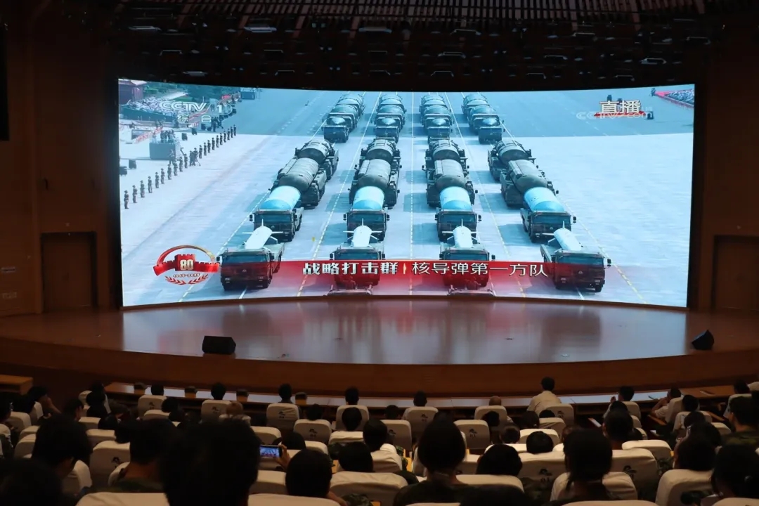 商学院党政领导班子成员、教师代表、全体2025级新生齐聚风则江大讲堂共同收看大会直播。当电视画面中五星红旗冉冉升起,全体师生自发起立,神情庄重肃穆,高声齐唱国歌。收看过程中,全场凝神屏息,聆听习近平总书记的重要讲话,为受阅官兵的卓越展现喝彩,全体师生深受鼓舞与感召,为祖国日益强盛的国防力量与繁荣昌盛无比自豪。大家纷纷表示,将传承伟大抗战精神,将爱国之情转化为报国之行,在各自岗位上为实现中华民族伟大复兴贡献力量;不忘历史,以史为鉴,不负时代,以青春之力融入中华民族伟大复兴征程。
